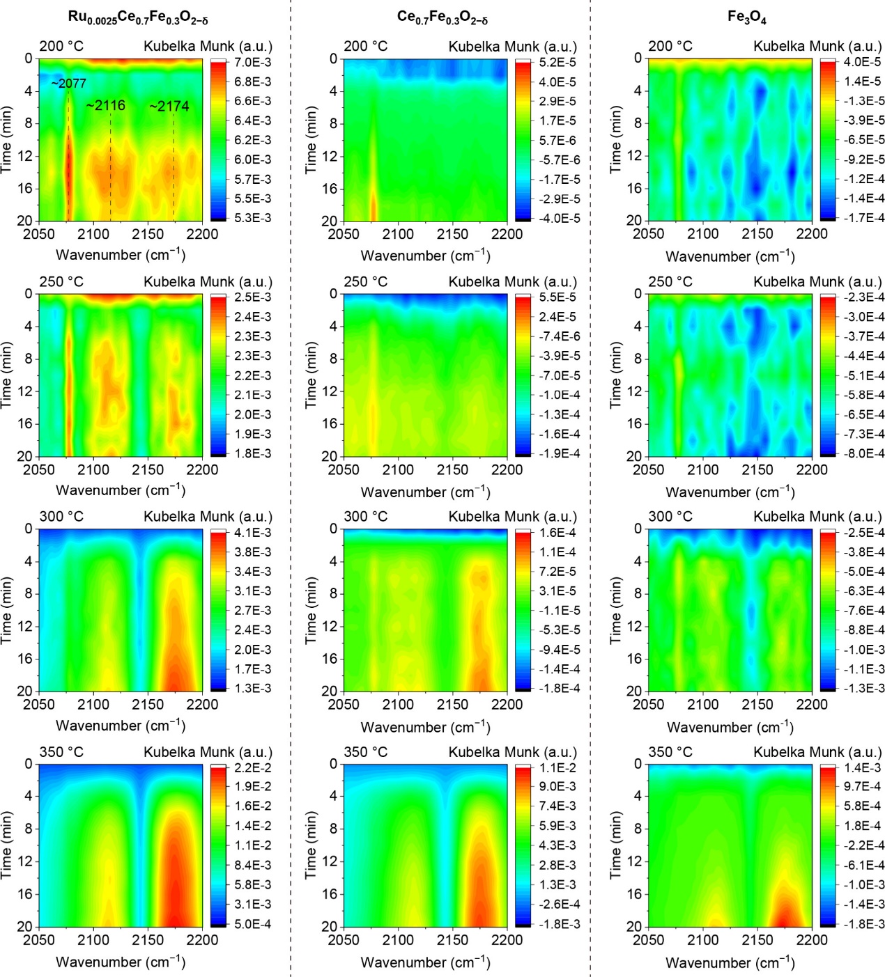 DFT计算表明CO2在Ru-Fe-VO位点上的直接解离为最有利的反应路径。原位红外光谱(in situ DRIFT)分析进一步验证了催化剂的低温活性和CO2解离吸附机制。在200°C时,Ru0.0025Ce0.7Fe0.3O2−δ催化剂表面已观察到大量的吸附CO*(~2077 cm−1)和气态CO(~2174和~2116 cm−1),而Ce0.7Fe0.3O2−δ和Fe3O4催化剂在350°C时才出现明显的气态CO信号。