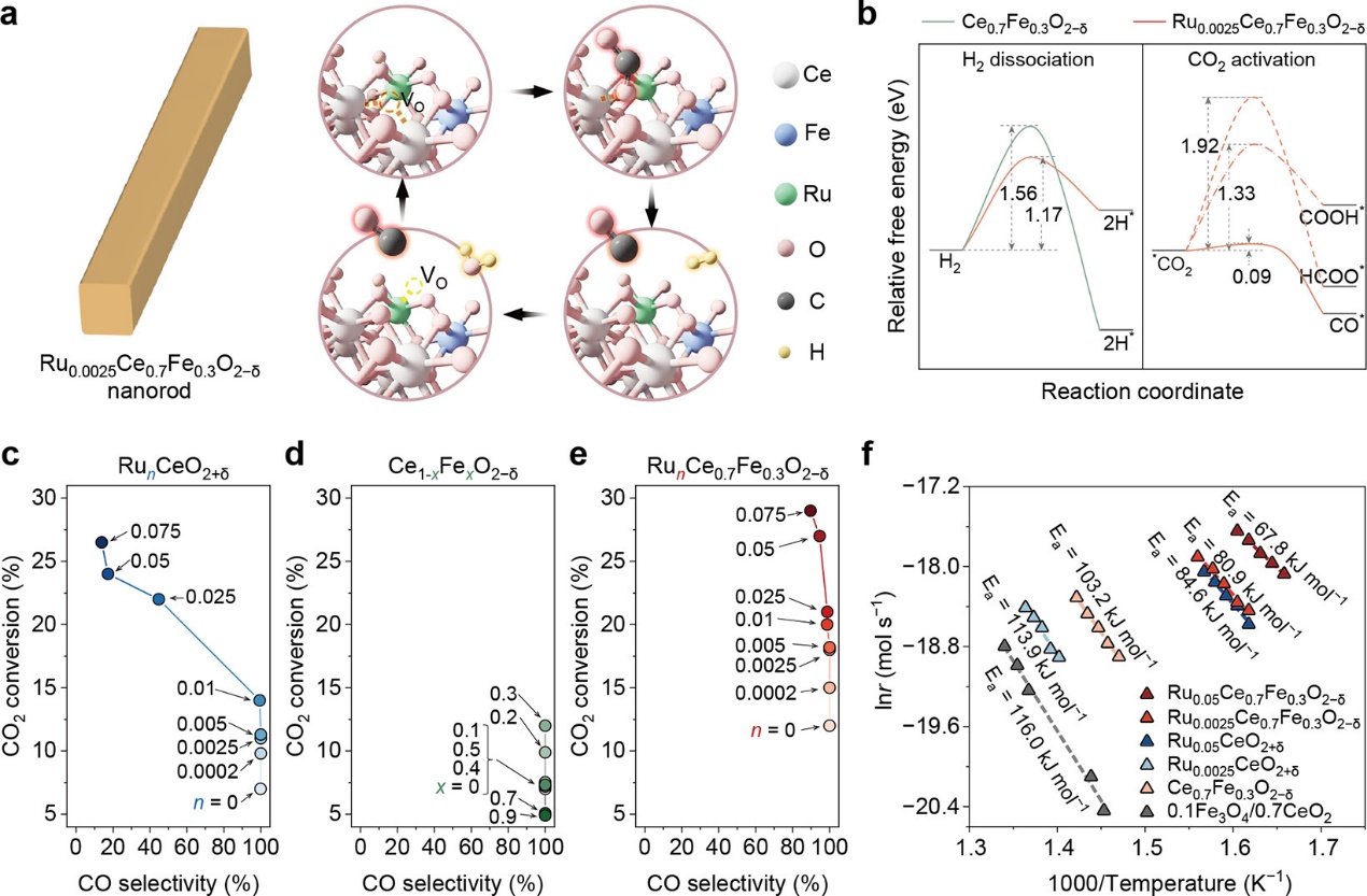 太阳成集团122ccvip钟苗课题组提出“Ru–Fe–氧空位(Vo in CeO2)三元异质位点协同催化”新策略。通过将0.25 at.%微量Ru与30 at.%的Fe共掺入CeO2晶格,制备了Ru0.0025Ce0.7Fe0.3O2−δ固溶体纳米棒催化剂。其中,形成的Ru–Fe–Vo活性中心可协同促进CO2解离吸附与H2活化,同时弱化CO*结合能,实现200°C低温下的RWGS反应开启,并在450°C时CO产率高达326 mmol g−1 h−1,选择性接近100%,且催化剂展现了优异的连续运行稳定性。
