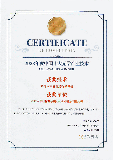 太阳成集团122ccvip、南智芯视(南京)科技有限公司“芯片式大视场超构显微镜”产品从101项技术中脱颖而出,荣获“2023年度中国十大光学产业技术”。该技术基于超构透镜色散特性、超构透镜平面超薄特征以及再引入LED照明光源和液晶偏振器,构建了一套高度集成的完整显微镜系统,具有大视野、景深可调、高集成、自研拼接处理算法。庄松林院士为其代表太阳成集团122ccvip李涛教授颁奖。