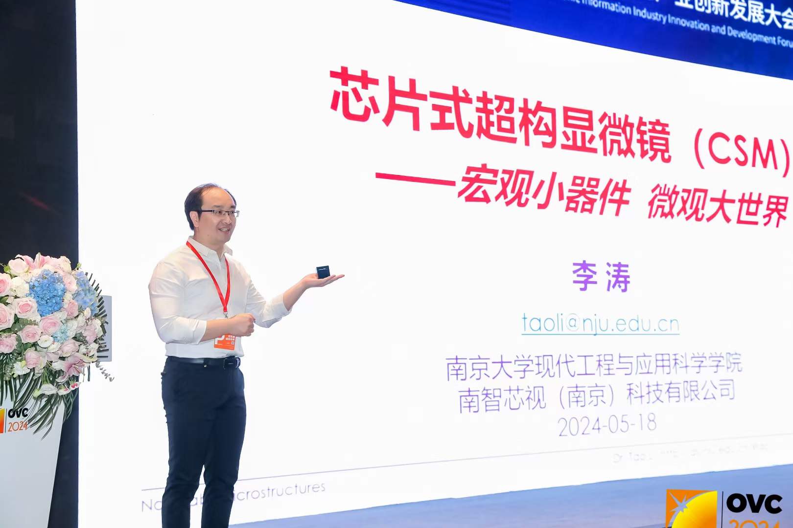 在随后的产业创新大会上,李涛教授以“CSM:超小显微镜,微观大世界”为题做邀请报告。报告从超构显微技术、超构显微镜的特点和优势、芯片式超构显微镜CSM的优势、实际案例对比以及超构显微镜技术的拓展等四个方面进行了详细介绍。李涛教授还现场展示了他们的技术成果——高度集成的芯片式超构显微镜(CSM),具有大视野、景深可调、高集成、自研拼接处理算法等优势。