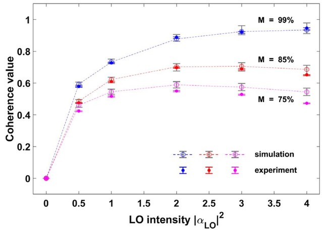 图2. 不同本地振荡器和干涉对比度下可调弱场零差探测器的相干值变化趋势。