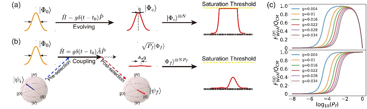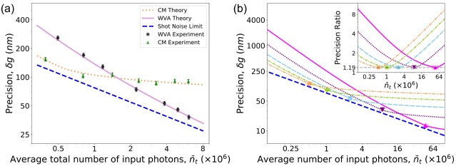 图3,(a)弱值放大方案与传统测量方案精度比较;(b)接近量子极限精度的弱值放大方案。