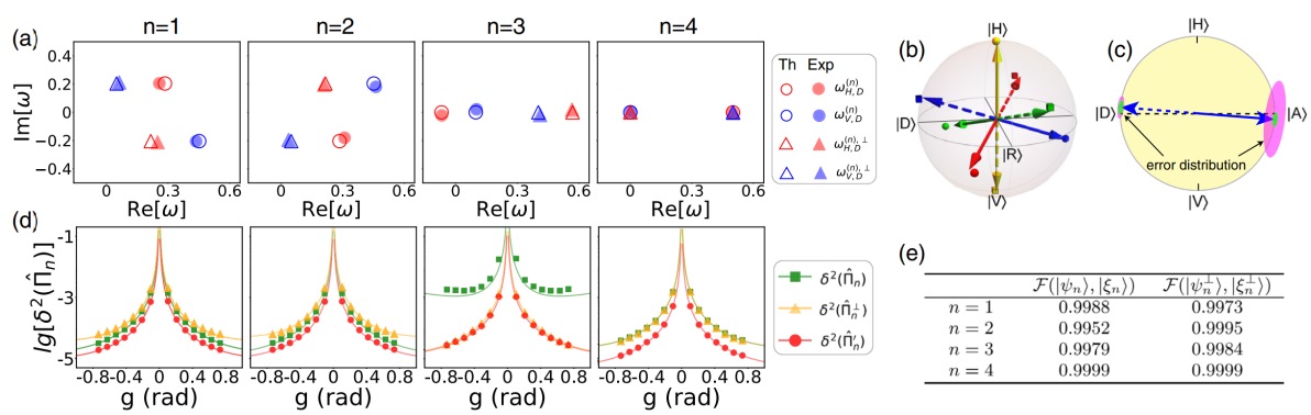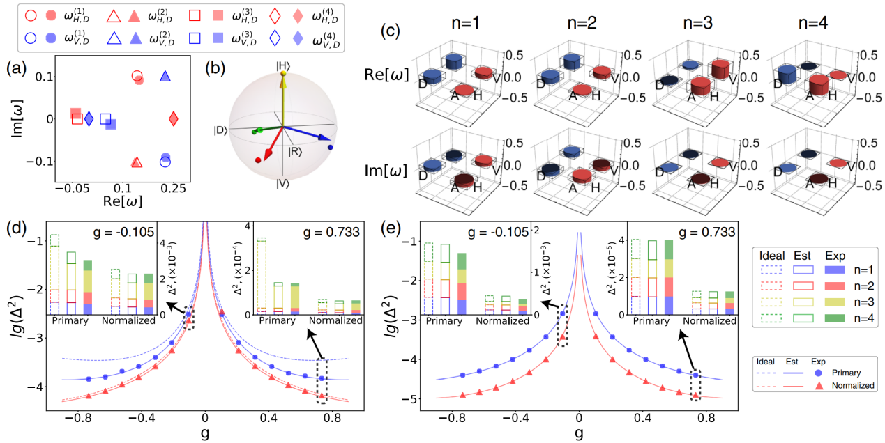 图3.对偏振自由度SIC POVM进行直接表征的实验结果(a、b、c)与精度分析(d、e)。