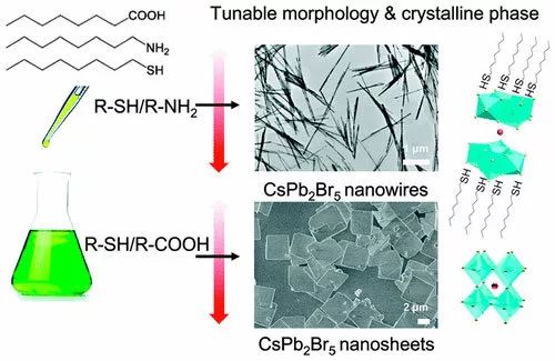 最近,公司邓正涛教授研究团队通过在经典合成工艺中引入硫醇配体,实现了CsPb2Br5纳米晶体的克量级可控制备,其形貌可以精确调控,得到高产率 (>99%)的一维CsPb2Br5纳米线和二维CsPb2Br5纳米片。他们通过调控硫醇和脂肪酸/脂肪胺配体的种类和配体,可控地诱导材料形貌和晶型的转变。反应在辛硫醇/油胺摩尔比为1:1.5时,可制备出高产率的CsPb2Br5纳米线;在辛硫醇/辛酸摩尔比为1:0.3时,可制备出高产率的CsPb2Br5纳米片。其中,一维CsPb2Br5纳米线在文献中属首次报道。