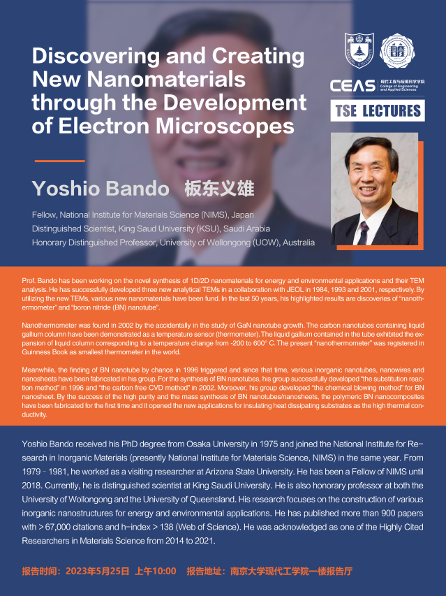 我们有幸邀请到沙特国王大学Yoshio Bando教授,作为 TSE Lectures 系列讲座的嘉宾。报告信息见下,欢迎各位老师和同学参加!