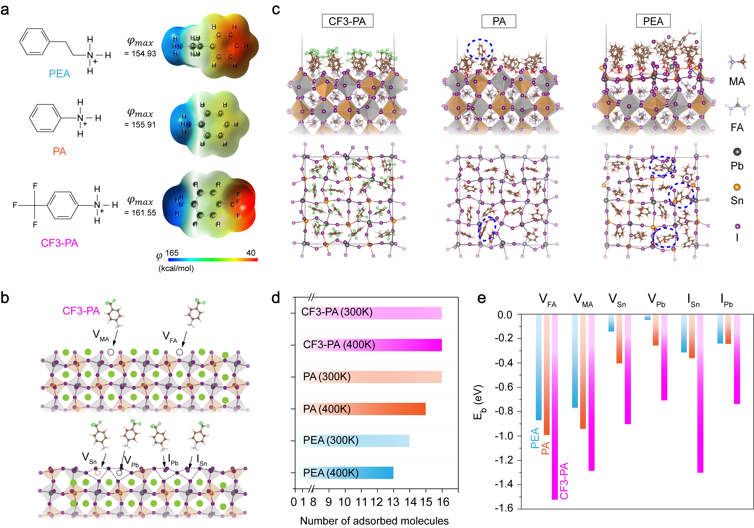 为解决上述瓶颈,本工作提出通过钝化窄带隙钙钛矿晶粒表面缺陷来提升薄膜的载流子扩散长度,从而制备出具有较厚吸光层和更高短路电流密度的电池,为实现更高效率的叠层电池奠定基础。表界面缺陷钝化是提升钙钛矿电池性能的常用策略,但钝化分子与晶粒表面间的相互作用机制一直尚未明晰;其次,加热结晶过程中,钝化分子表面吸附动力学过程对于表面缺陷钝化效果至关重要,但领域中前期研究对这一关键点尚未引起关注。本工作中,通过分子动力学模拟研究发现,常用的钝化分子苯乙铵阳离子(PEA)在钙钛矿结晶过程中(温度大约100°C),与钙钛矿晶粒表面的吸附较弱,未能完全钝化表面缺陷位点。通过结构设计来调控钝化分子的极性,采用铵基端正电性更强的4-三氟甲基苯铵阳离子(CF3-PA)作为窄带隙钙钛矿的钝化分子,可以有效提升钝化分子在结晶温度下与缺陷位点的吸附能力。DFT计算结果表明,CF3-PA的极性强于PEA分子,与表面缺陷间具有更强的结合能,能更充分和更有效地钝化表面缺陷(如图1所示)。