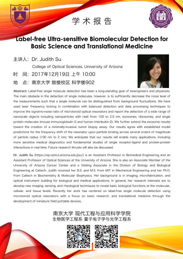 12月19日College of Optical Sciences,University of Arizona,Dr.Judith Su 学术讲座