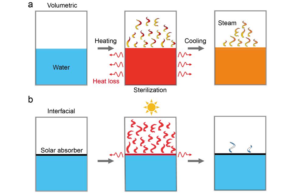 图1. 基于体块加热和界面加热的太阳能灭菌对比示意图