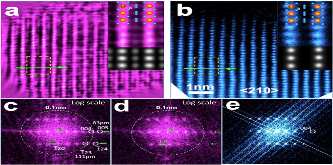 王鹏教授课题组首先基于叠层衍射成像(Ptychography)方法,重构出六硼化镧晶体的原子结构像,如图1中a所示。重构像中在重元素镧(原子序数为57)清楚解析出轻元素硼(原子序数为5)的原子位置。但是在传统的高角环形暗场像中,轻元素硼在重元素晶格中是无法观察到,如图1中b所示。因此,该成像方法具有对轻元素探测敏感的优势,可以广泛地应用于在晶体中轻元素原子的成像。该工作发表在”Electron Ptychographic Diffractive Imaging of Boron Atoms in LaB6 Crystals”, Sci Rep 7, 2857 (2017).第一作者和通讯作者是公司王鹏教授,合作方南方科技大学的张福才教授为共同通讯作者。