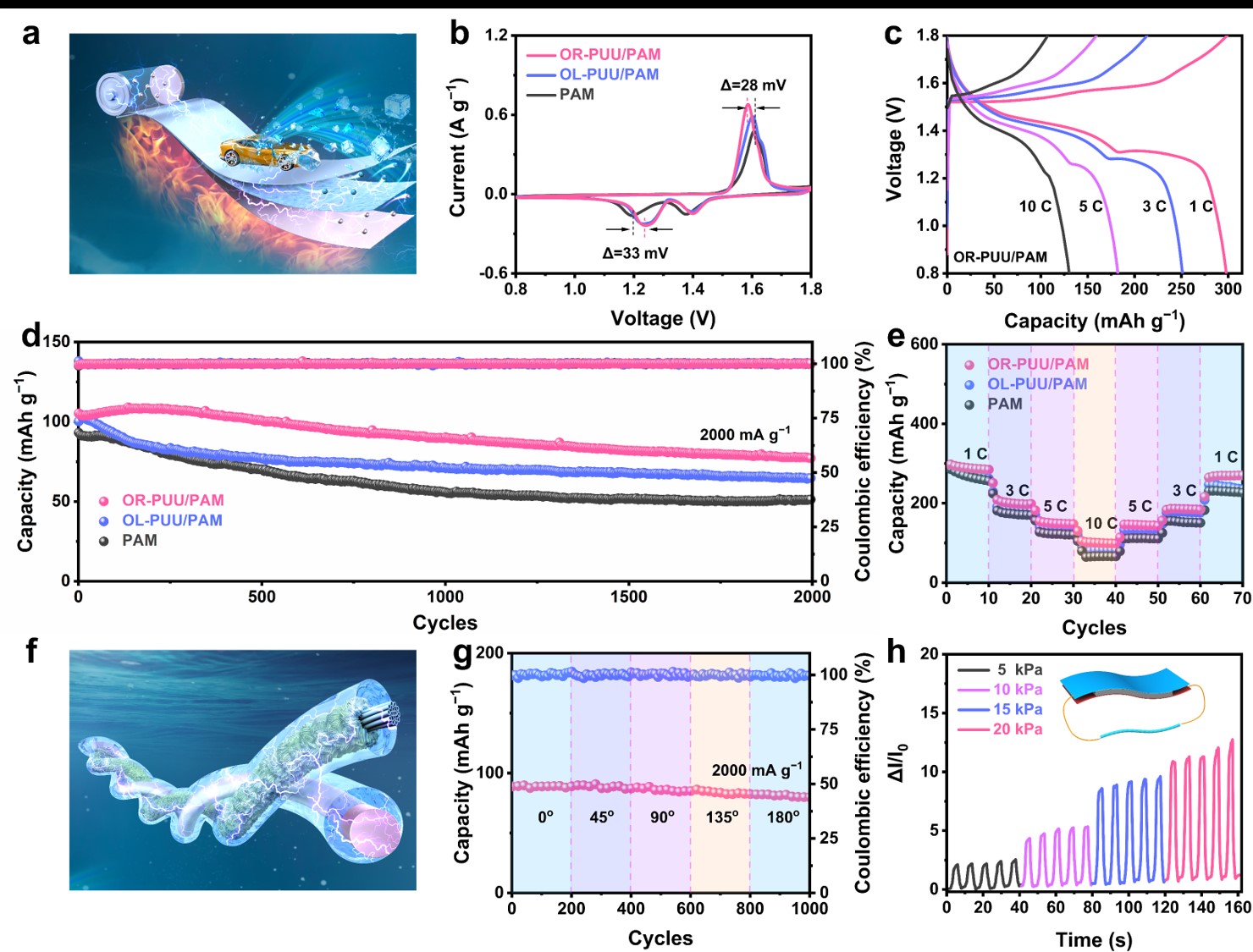 (a)柔性锌-二氧化锰电池示意图。(b)不同HEs的CV曲线。(c)不同电流密度下OR-PUU/PAM HE的充放电曲线。(d)在电流2000 mAh g-1下,不同HEs条件下柔性锌-二氧化锰电池的循环稳定性。(e)不同HEs条件下柔性锌-二氧化锰电池的倍率性能。(f)纤维状锌-二氧化锰电池示意图。(g)不同弯曲曲率下纤维状锌-二氧化锰电池的循环稳定性。(h)纤维状锌锰电池供电的柔性压力传感器在不同压力下的I-t曲线。