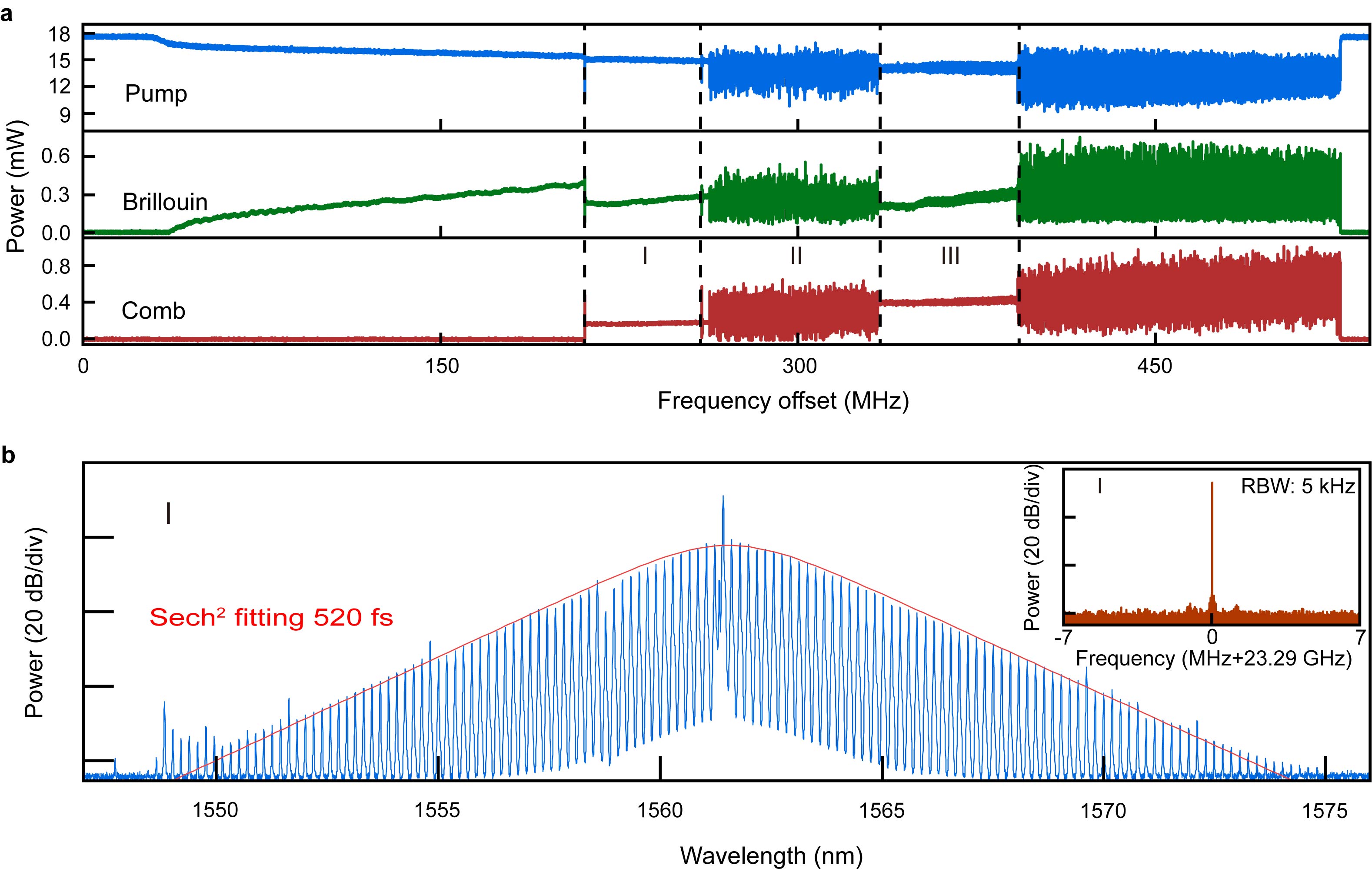 图2 (a) 透射功率扫描谱:蓝色,泵浦光;绿色,布里渊激光;红色,光学频率梳。其中I区为单稳态单孤子区。(b) 单稳态单孤子光谱。