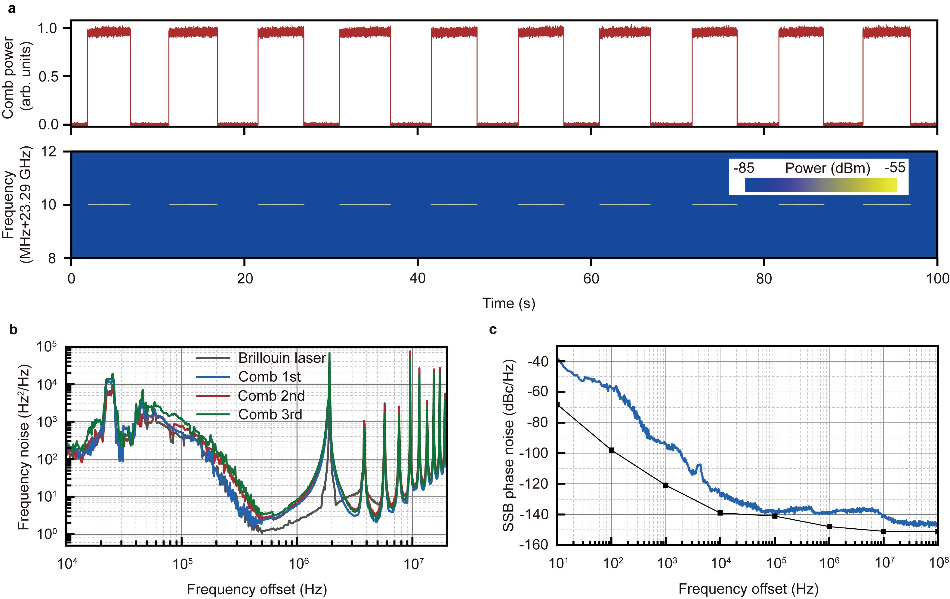 图3 (a) 开关光频梳功率(上图);实时拍频信号(下图)。(b) 布里渊激光以及临近梳齿的频率噪声谱。(c) 孤子重复频率的相位噪声谱(载波频率23.29 GHz)。