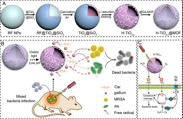 图1.(A)H-TiO2-x@MOF的合成路线示意图。(B)H-TiO2-x@MOF用于清除MRSA和PA引起的复杂感染示意图。(C)Ga3+与H-TiO2-x通过“里应外合”策略构建氧化应激放大器用于破坏MRSA抗氧化防御系统示意图。