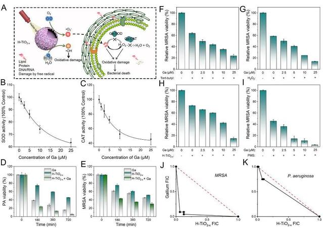 图2. (A) Ga3+ 与H-TiO2-x发挥协同效应示意图。B,C)不同浓度Ga3+对MRSA的SOD酶及CAT酶活性的影响。D,E)Ga3+ 与H-TiO2-x 对MRSA及PA随时间变化的抑制效率。(F-I)不同浓度Ga3+处理MRSA对过氧化物(tert-butyl,H2O2)和超氧化物(H-TiO2-x,PMS)的敏感性测试。(J-K)棋盘法分别测定Ga3+ 与H-TiO2-x对MRSA及PA的协同作用。