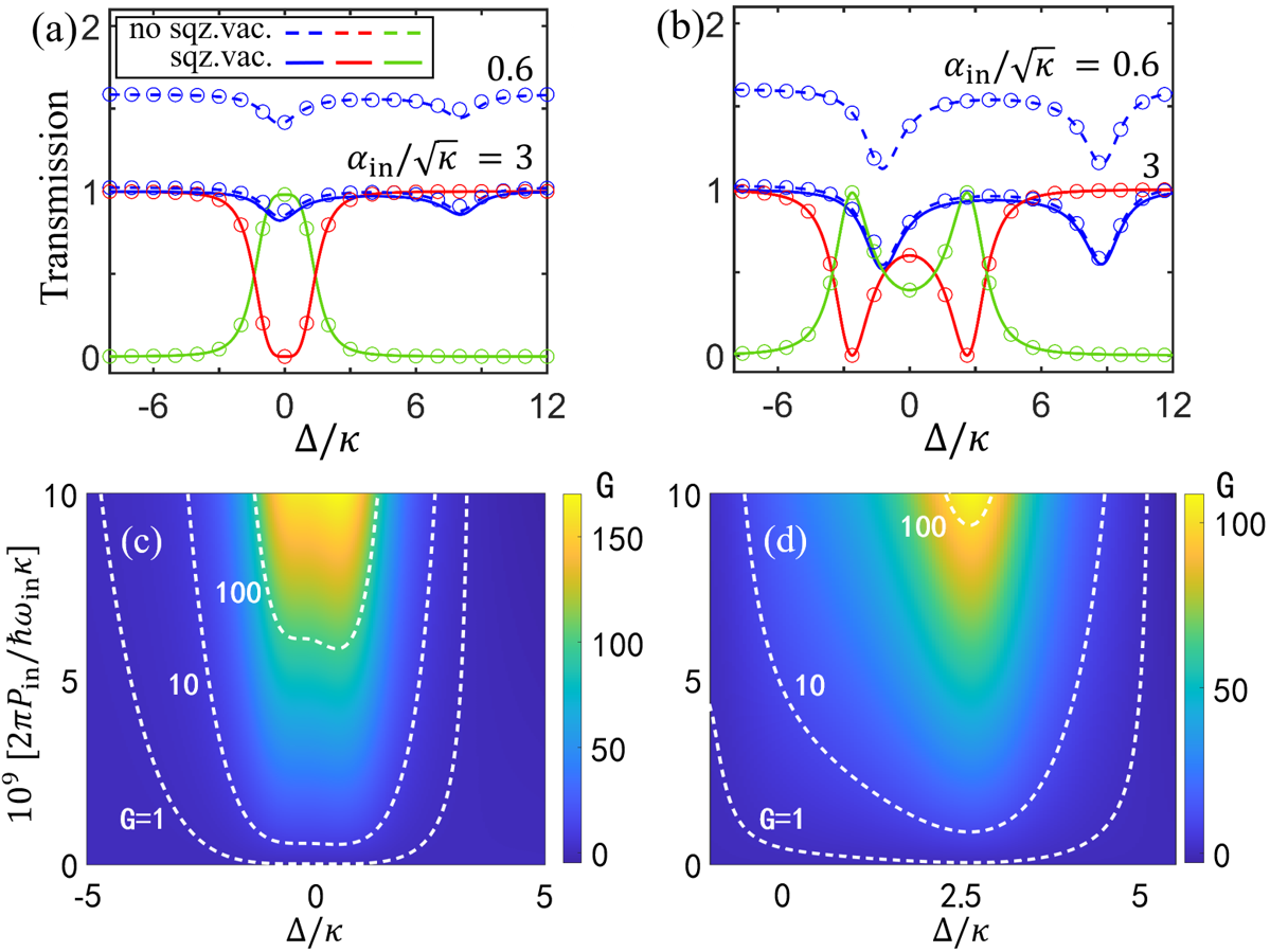 图2 (a, b)光隔离器与光环形器的透射谱,红色曲线表示,蓝色曲线表示,绿色曲线表示;(c, d)光子晶体管的增益。
