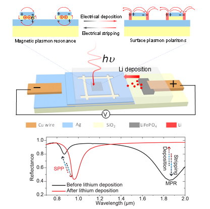 研究人员选择银基金属-介质-金属(Ag-SO2-Ag)三明治栅状结构作为产生磁等离激元共振的微纳结构单元。以此结构作为一侧电极,以含锂正极材料为另一侧电极,组装平面结构锂金属电池。在含锂离子的有机电解液中,施加合适电流后,锂可选择性地在金属-绝缘体-金属三明治栅状结构的侧壁垂直沉积生长,当金属锂连接上层金属和下层金属衬底后,使得不连续的金属-介质-金属结构变为连续的单界面金属光栅结构,局部磁场激发(磁等离激元共振MPR,1.85um反射谷)切换为非局域电场激发(表面等离激元共振SPP,1um反射谷)。
