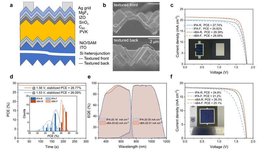 图3.全绒面钙钛矿/晶硅叠层的器件特性。(a)叠层太阳能电池示意图。(b-e)小面积叠层器件的光电转换效率。(f)大面积叠层器件的光电转换效率