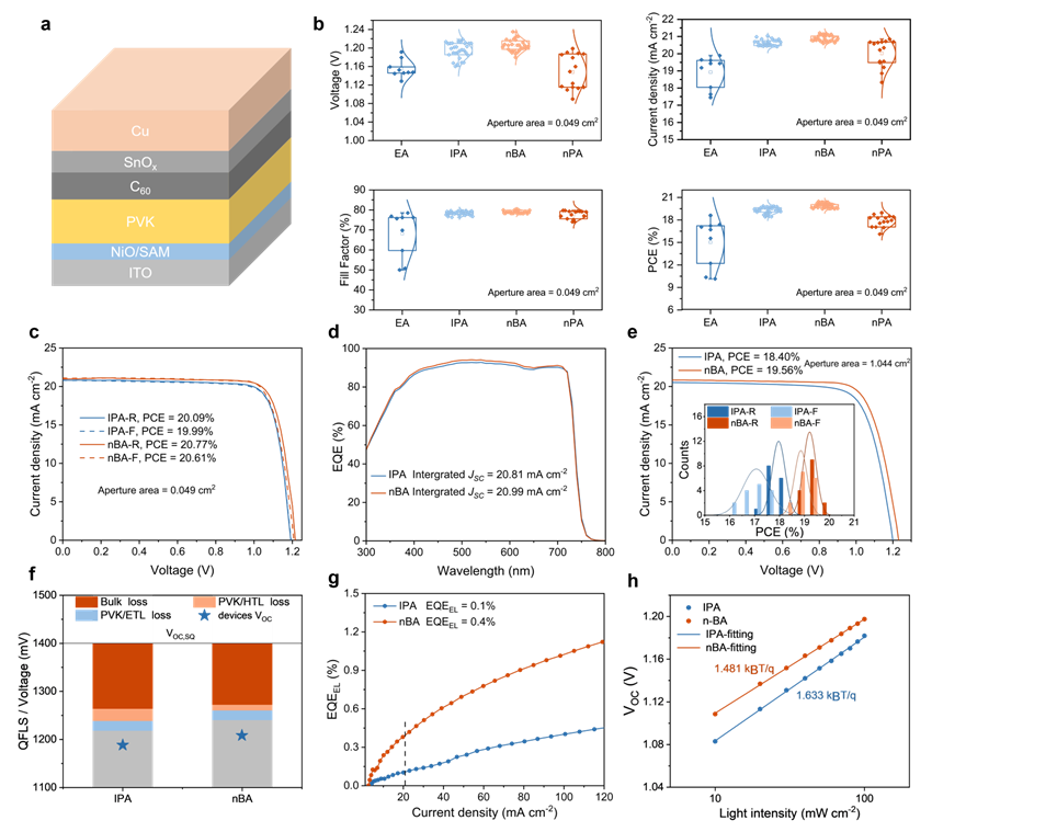图2.不同醇类制备的PSCs的光伏性能。(a)单结结构示意图。(b-e)不同醇类制备的单结器件的光电转换效率。(f-h)正丁醇制备的器件在体相、界面的优势