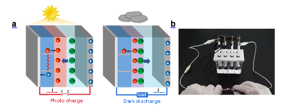 除了开展半导体表界面机理研究,该团队还致力于法拉第全器件的构筑(Angew. Chem. Int. Ed. 2020, https://doi.org/10.1002/anie.202011930;中国发明专利,申请号:2020110398345)。该团队开发了Si/WO3电容型法拉第结,发现了其具有光致界面势垒高度连续可调的新特性,并构筑了两端口全器件,首次实现了无偏压太阳能光充电-暗放电,可用于直接太阳能转化与存储(图3)。