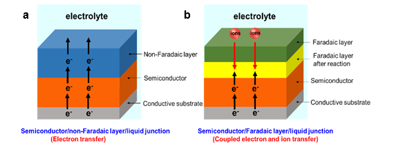 法拉体(Farador)是一种电子离子耦合传输导体,半导体和法拉体接触形成法拉第结 (图1)。传统半导体结的载流子为电子,界面电荷转移不会引起化学变化。而法拉第结的载流子为耦合电子和离子,界面电荷转移则会引起化学变化。法拉第结可用于各种太阳能转化与存储器件。目前法拉第结的界面电荷传输机制建立在半导体结能带理论的基础上,然而经典能带理论无法解释其特殊界面电荷传输行为。因此,阐明法拉第结界面电荷传输机制,对建立半导体表界面新理论、开发太阳能转换新器件具有非常重要的意义。