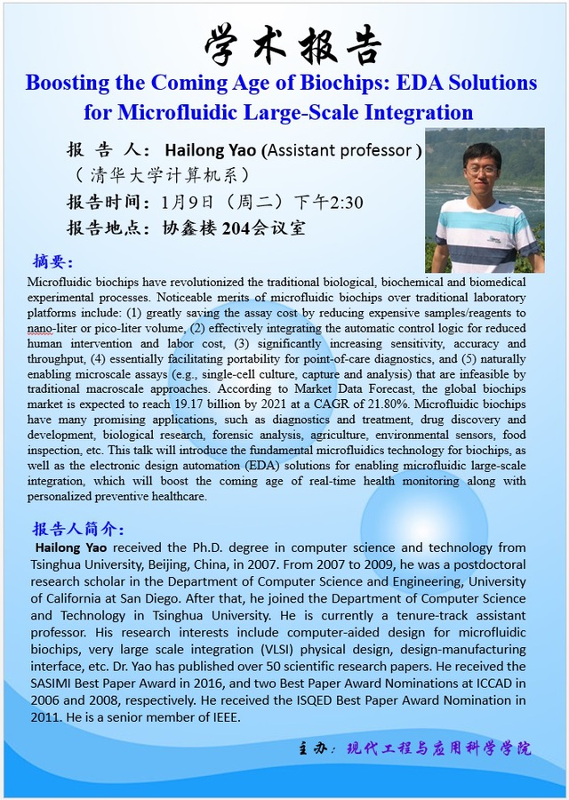 Hailong Yao received the Ph.D. degree in computer science and technology from Tsinghua University, Beijing, China, in 2007. From 2007 to 2009, he was a postdoctoral research scholar in the Department of Computer Science and Engineering, University of California at San Diego. After that, he joined the Department of Computer Science and Technology in Tsinghua University. He is currently a tenure-track assistant professor. His research interests include computer-aided design for microfluidic biochips, very large scale integration (VLSI) physical design, design-manufacturing interface, etc. Dr. Yao has published over 50 scientific research papers. He received the SASIMI Best Paper Award in 2016, and two Best Paper Award Nominations at ICCAD in 2006 and 2008, respectively. He received the ISQED Best Paper Award Nomination in 2011. He is a senior member of IEEE.