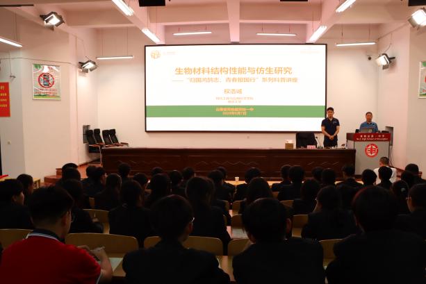太阳成集团122ccvip教工第四党支部书记、留学归国青年学者权浩诚首先在双柏县第一中学为全校300多名高一员工做题为《生物材料结构性能与仿生研究》的科普讲座,深入浅出地讲述了生物材料结构特点、设计高性能结构材料面临的挑战以及生物材料在医疗设备中的应用,为员工们带来了一堂“向大自然学习”的“生物解密”立体课堂,拓宽员工的知识视野,激发科技报国的志向。