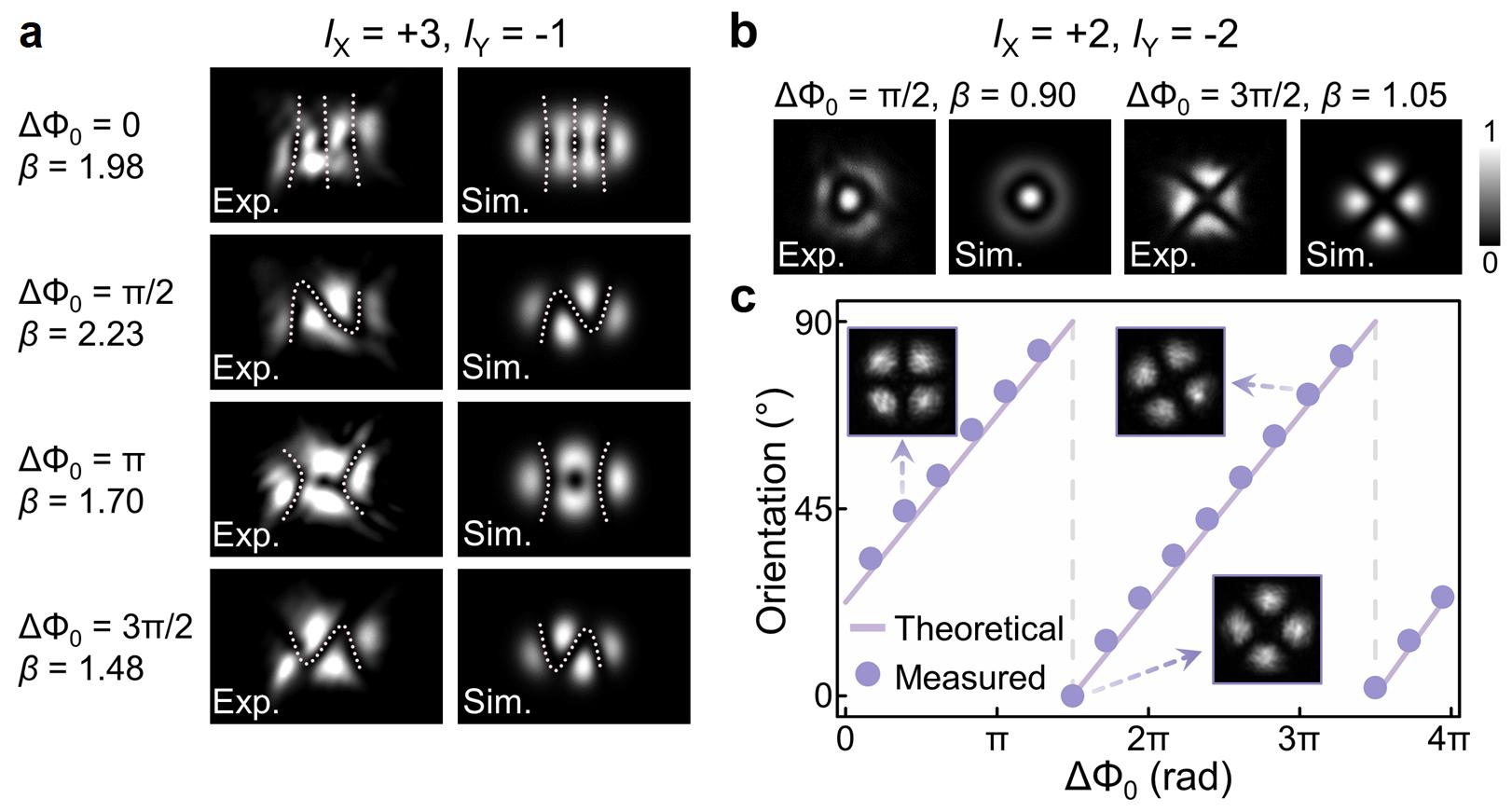 图3针对轨道角动量模式的二元运算:(a, b)比较拓扑荷数值,(c)可视化呈现相对相位