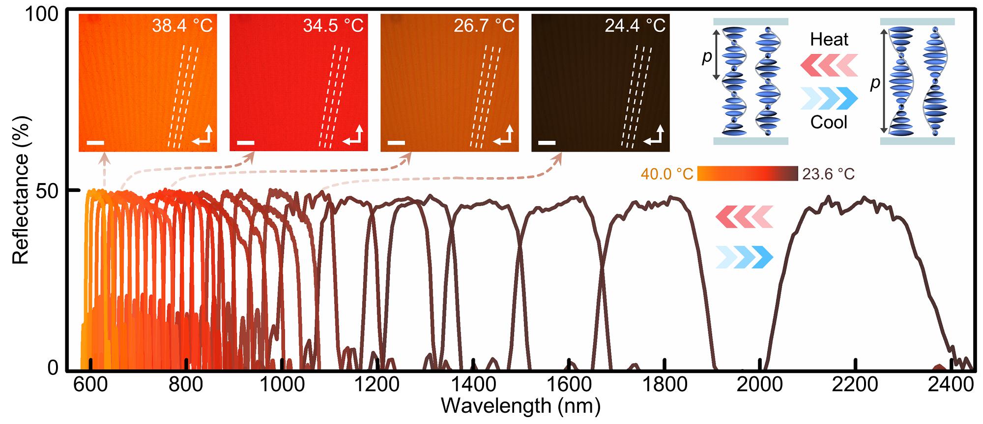 针对这一挑战,太阳成集团122ccvip陈鹏副教授、陆延青教授团队在此前液晶光计算元件研究【Nano Letters 24, 140 (2024); National Science Review 11, nwae247 (2024)】的基础上,利用胆甾相液晶光子带隙的偏振态投影效应,结合半透半反调制、外场刺激响应等特性,设计并开发了一种新型光学二元运算器,其概念如图1所示。当入射波长落在左旋胆甾相液晶手性光子带隙内时,透射光和反射光将分别发生到右旋和左旋圆偏振态上的投影,使得编码在线偏振态上的两个输入变量发生相干叠加。除基础的叠加外,胆甾相液晶独特的反射式几何相位将进一步解锁非平凡的运算功能。为了扩展液晶材料的热调控性能,团队精心设计了一种非手性向列相主体与双元手性剂的混合材料体系,以对温度敏感的手性剂为主导成分,以对热不敏感的手性剂为辅助矫正成分,打破单组分手性剂的固有限制,灵活满足光子带隙热调控的全方位需求,成功实现了超过1600 nm的工作波长动态范围,覆盖可见光至近红外的广阔区间,如图2所示。