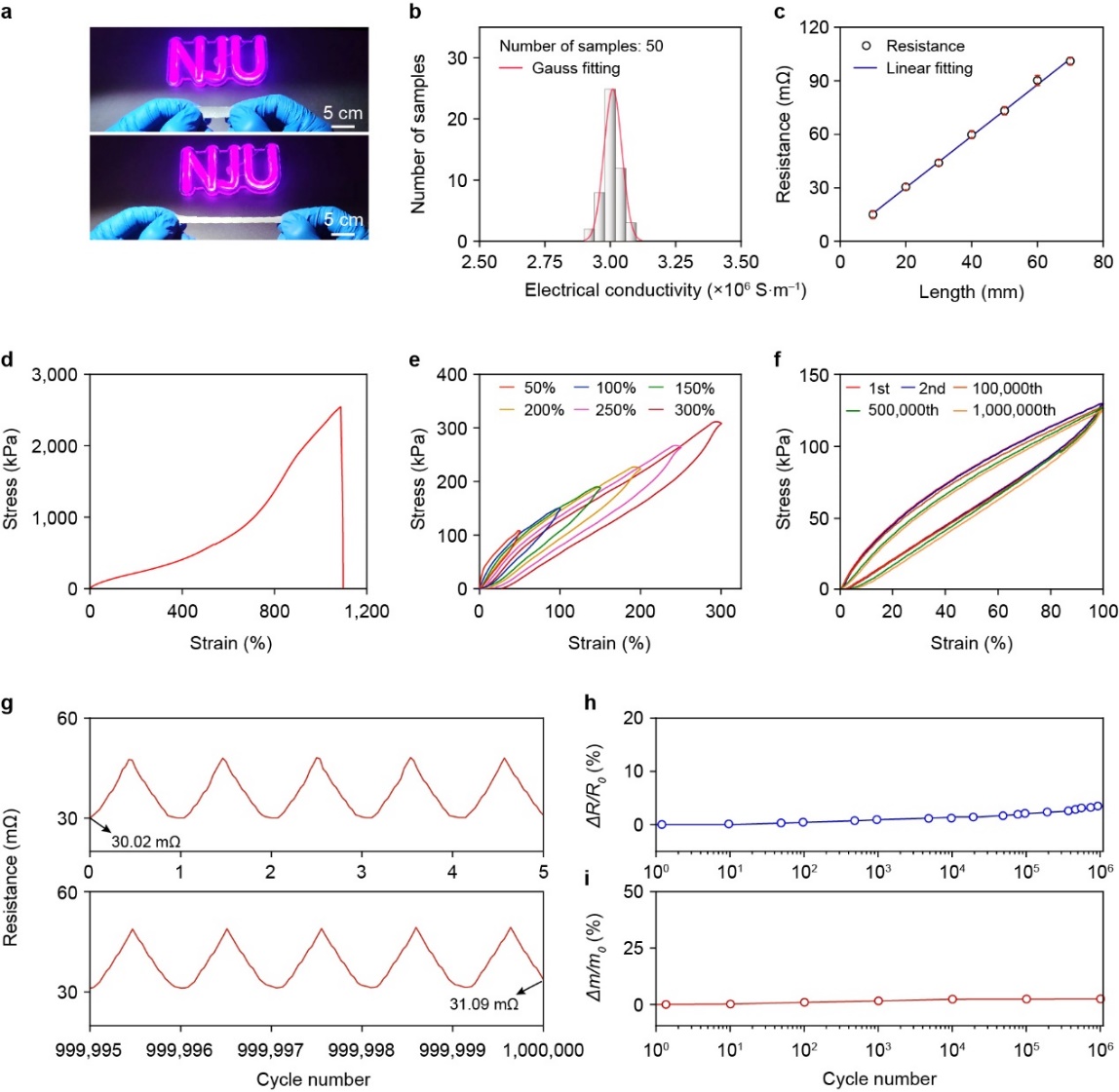 这种独特的结构设计使得金属凝胶具备了金属般的电学性能与橡胶般的力学性能(图3)。其中,平均电子电导率高达3 × 106 S·m‒1,与传统金属在同一数量级。单轴拉伸量最大可达1100%,具有与生物软组织匹配的杨氏模量(264 kPa),且较高的韧性(10.07 MJ∙m −3)。更重要的是,经过100万次100%拉伸量的极端循环拉伸测试后,金属凝胶表现出稳定的电学性能,电阻变化仅为3.3%。