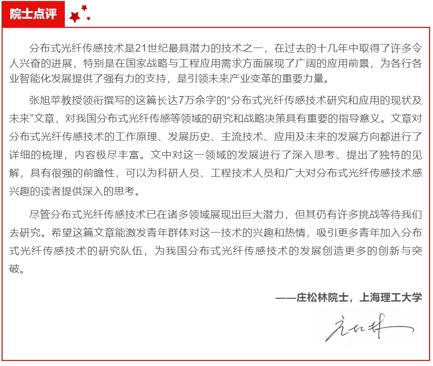 公司张旭苹教授受中国激光杂志社邀请,联合16家单位、22位专业学者领衔撰写了综述文章《分布式光纤传感技术研究和应用的现状及未来》,公司张益昕和王峰两位老师为共作者。该文被选为《光学学报》2024年开年专题“分布式光纤传感”的封面文章。文章不仅系统性地阐述了分布式光纤传感技术的工作原理及工程应用,还梳理了分布式光纤传感技术的发展历史、研究进展,并对其发展方向进行了展望。论文一经发表便引起了能源、电力、航空航天、通信、交通、安防等诸多领域专家的关注,单月下载量创历史纪录。