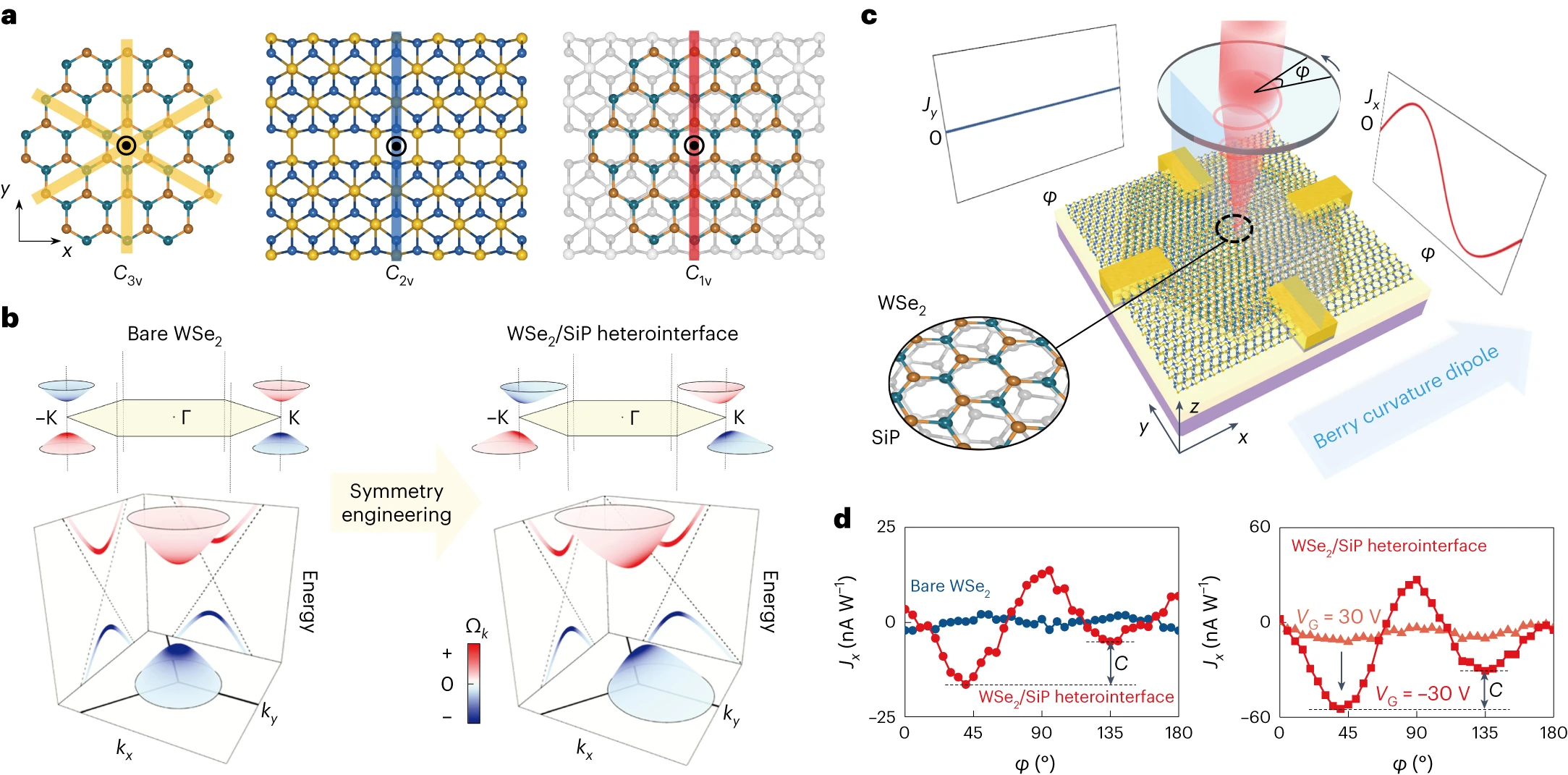 近日,太阳成集团122ccvip袁洪涛教授团队与合作者们,创新性地提出了一种能够在半导体异质界面结构中通过晶格对称性破缺来产生贝里曲率偶极矩的普适方法,并在WSe2/SiP异质界面上观察到了栅极可调、具有谷自旋极化的圆偏振自旋光电流现象。