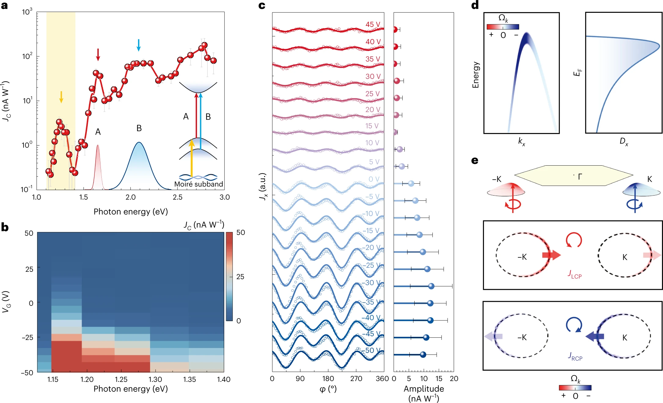 为了理解圆偏振自旋光电流产生过程中光学跃迁的细节,作者们研究了WSe2/SiP异质界面上圆偏振自旋光电流的对入射光的波长依赖响应,进一步发现与1.2 eV处的共振峰相对应的圆偏振自旋光电流的幅度可以通过施加负的栅极偏压强烈增强(图3)。它的栅极演化行为恰好遵循了贝里曲率偶极矩随费米能级变化的演化规律,随费米面下降呈现先增大后减小的趋势,表明了圆偏振自旋光电流的本质起源是来自于对称性不匹配的异质界面处电子带结构的贝里曲率偶极矩。文章作者们推测,这个共振峰可能对应于单层WSe2的带内光学跃迁。由于光子动量极小,因此通常情况下,带内光学跃迁因动量守恒而被禁止。然而,WSe2和SiP之间的晶格失配打破了WSe2中的动量守恒,使得带内跃迁成为可能。重要的是,异质界面上形成的新的莫尔(Moiré)周期,因此异质界面的布里渊区的发生折叠而产生莫尔子带。在这个莫尔布里渊区中,圆偏振光激发过程可以被理解为是从莫尔子带跃迁到WSe2价带顶的直接光学跃迁过程。需要注意的是,圆偏振自旋光电流是具有谷选择性的,结合单层TMD材料中的自旋–能谷锁定的性质,上述能谷不平衡性质进一步导致谷自旋极化的圆偏振自旋光电流同时也是自旋极化的,明确论证了在WSe2/SiP异质界面中能带的贝里曲率偶极矩–自旋–能谷三重锁定的性质,为拓扑光电子自旋器件奠定重要基础。