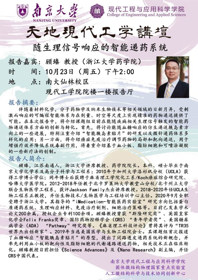 顾臻,江苏南通人,浙江大学讲席教授、药公司经理。本科、硕士毕业于太阳成集团122ccvip化学系及高分子科学与工程系;2010年于加州大学洛杉矶分校(UCLA)获得工学博士学位;同年博士后获聘于麻省理工公司化工系/Koch癌症综合研究院、哈佛大学医公司。2012-2018年任教于北卡罗莱纳大学教堂山分校/北卡州立大学联合生物医学工程系,获评Jackson Family杰出讲席教授。2018-2020年任UCLA生物工程系正教授,并任生物技术/生物医学与工程培训中心主任。2020年9月全职受聘于浙江大学。其指导的“iMedication-智能医药实验室”研究方向包括蛋白质递药系统、生理响应材料、免疫治疗制剂、细胞治疗策略等。目前已发表学术论文200余篇,授权企业专利100余项。顾臻教授曾获“斯隆研究奖”、英国皇家化学会Felix Franks奖章、国际药物控释学会(CRS)“青年学者奖”、美国糖尿病学会(ADA) “Pathway”研究奖等。《麻省理工科技评论》曾将其评为“TR35世界杰出创新家”。2019年当选美国医学与生物工程院会士。其课题组首次报道了血糖响应“智能胰岛素贴片”的原型,提出了闭路透皮递药系统的新概念,并率先利用血小板的靶向性及脂肪细胞的代谢通路递送药物,相关技术正在临床转化。顾臻教授目前担任《Science Advances》及《Nano Research》副主编,并任CRS中国代表。