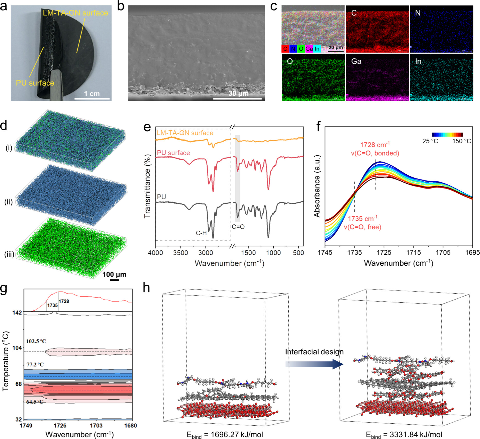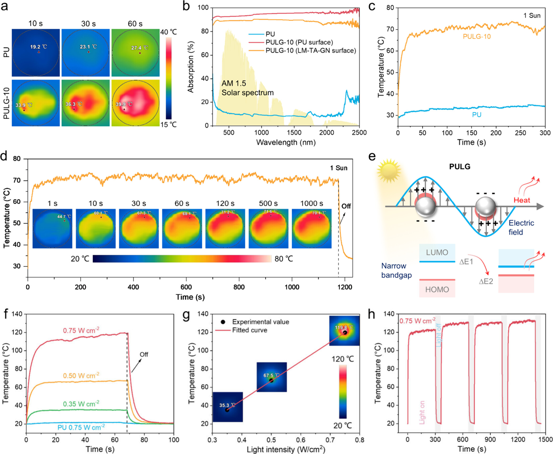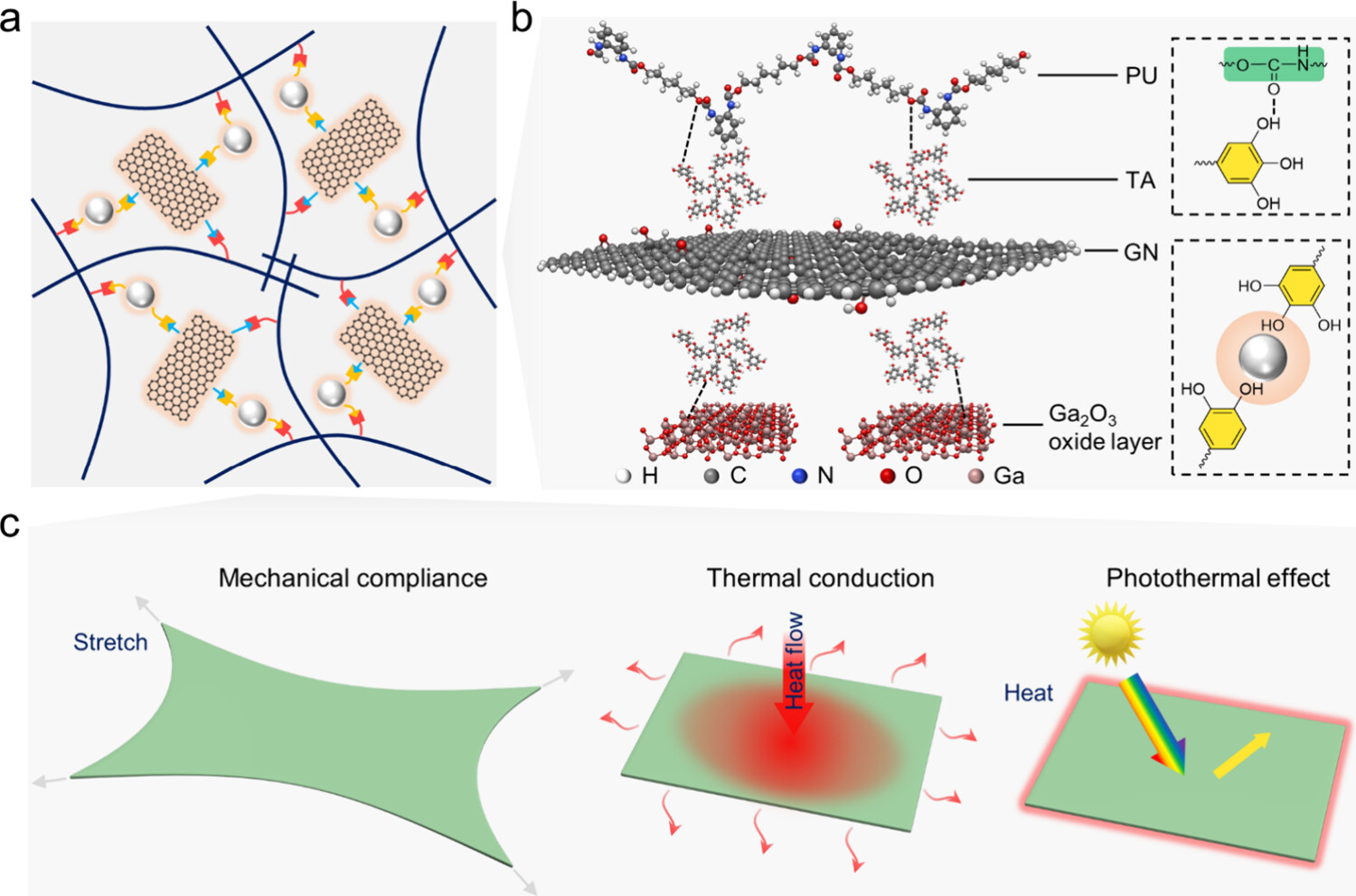 近日,太阳成集团122ccvip姚亚刚教授课题组提出了一种非共价组装策略,通过多酚介导的液态金属(LM)与石墨烯(GN)二元填料(即LM-TA-GN)嵌入聚氨酯(PU)基体,开发出新型软质复合材料(PULG)。天然多酚(如单宁酸,TA)具有丰富的疏水性芳环和亲水性酚羟基,能在复合材料内部形成多重界面超分子相互作用。LM-TA-GN颗粒与PU链之间的这种相互作用至关重要,使材料同时具备卓越的导热性能和机械顺应性。此外,该复合材料还表现出强的宽带光吸收能力与出色的光热转换效率,在普通日光和808 nm近红外激光照射下均能有效发挥作用。这一研究成果突破了传统材料在高导热性与机械顺应性之间的权衡限制。同时,该设计策略也为需要功能集成的先进热管理材料开辟了新路径。