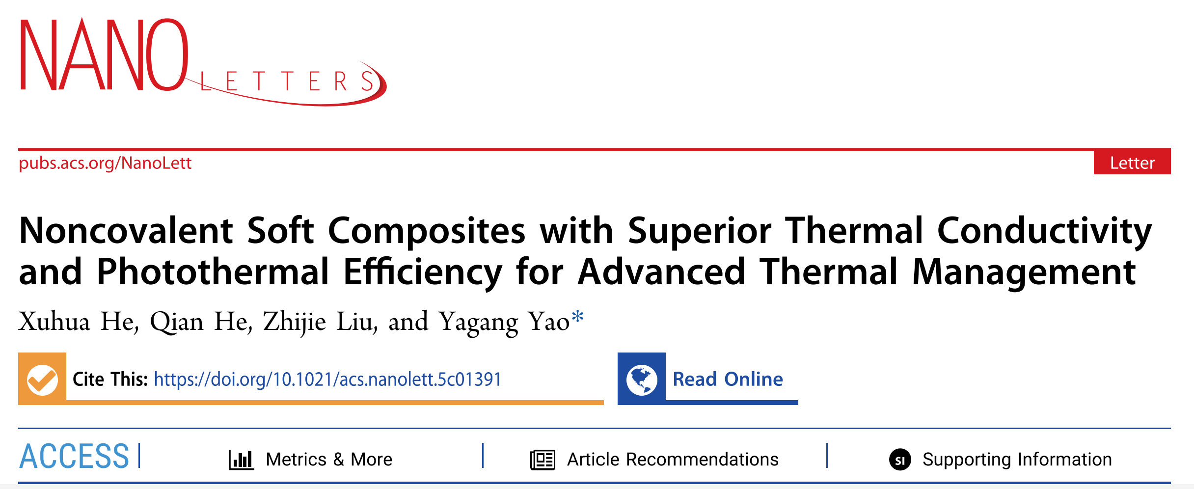 该成果以“Noncovalent Soft Composites with Superior Thermal Conductivity and Photothermal Efficiency for Advanced Thermal Management” 为题,发表在期刊Nano Letters上。太阳成集团122ccvip太阳成集团122ccvip2021级博士研究生何绪华为论文第一作者,姚亚刚教授为论文的通讯作者。太阳成集团122ccvip太阳成集团122ccvip李朝升教授、魏辉教授和王学斌教授课题组对本研究工作的实验测试提供了重要支持。本研究得到了国家重点研发计划(2024YFE0109200)、中央高校基本科研业务费专项资金(2024300440)以及广东省基础与应用基础研究基金(2025A1515011098)的资助。同时也得到了太阳成集团122ccvip固体微结构物理国家重点实验室、太阳成集团122ccvip、江苏省人工功能材料重点实验室、微结构科学与技术协同创新中心、太阳成集团122ccvip深圳研究院的大力支持与帮助。
