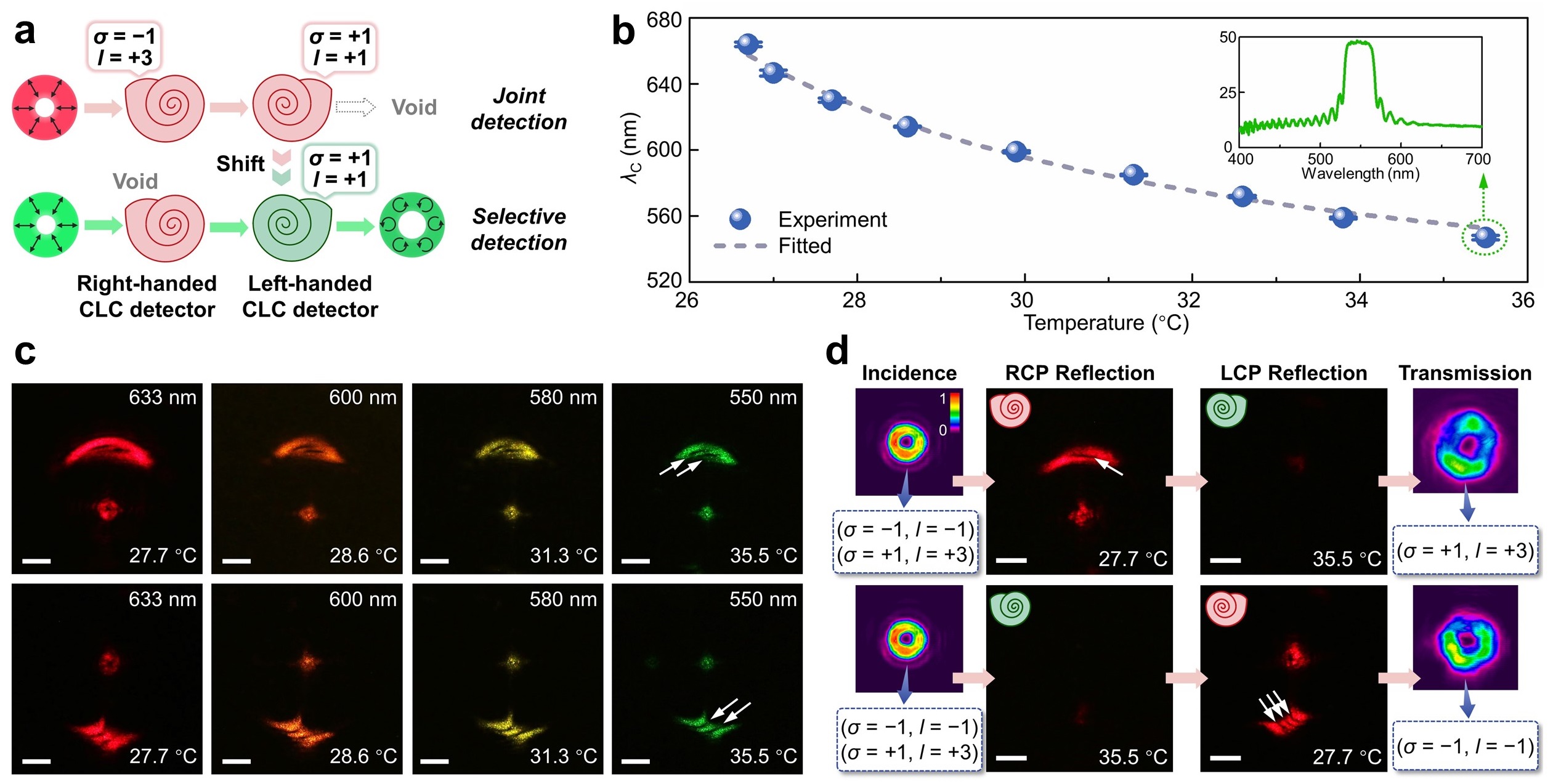 图2. a) 概念设计示意图;b) 手性光子带隙的热响应性;c) 不同工作波长的联合检测;d) 单波长的选择性检测。