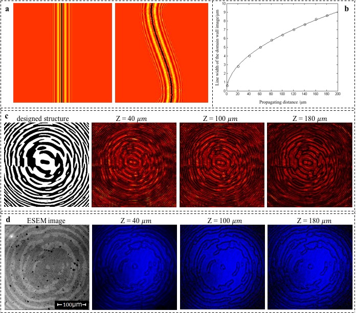 利用铁电畴畴壁在非线性成像过程中的特殊衍射性质,该课题组提出了一种简单的非线性成像方法,能够直接并实时地观测二维无规铁电畴结构。该工作主要分为理论和实验两部分。理论上主要从衍射方程出发,对铁电畴畴壁的二次谐波衍射特性进行了理论分析,给出了一对正负畴的倍频传输场强分布的解析解,发现畴壁处的倍频像始终呈暗场。随后我们通过进一步的理论分析,发现畴壁的倍频像线宽在一定区域内与传播距离的平方根成正比,与正常的远场衍射过程(一次方)相比畴壁像的展宽得到了极大的抑制,为直接成像提供了可能性。在此基础上,将单一畴结构推广到复杂的无规则畴结构,进一步通过数值仿真模拟二次谐波成像证实了传输过程中畴界的近似无衍射性质。该工作的实验部分主要以钽酸锂为例,用900nm的飞秒激光打到样品上,在CCD中可以直接收集到450nm的倍频畴结构像,其中畴界显示为暗场。结果表明,可以在百微米范围内连续观测到畴结构的清晰倍频像,其中衍射效应确实得到了很好的抑制。