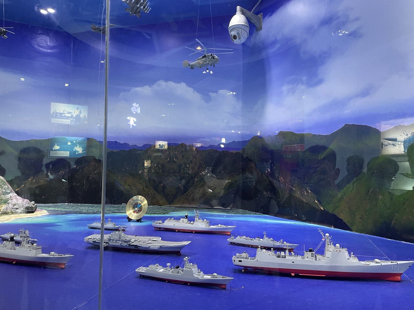 结束了室外的参观,同志们进入室内展厅,领略了中国军队的风采。讲解员依次给大家介绍了陆军、空军、海军、战略支援部队等军队,也介绍很多中国自主研发的轰炸机、预警机、战斗机,有多项指标处于世界领先地位。在展厅的中间是一艘战斗机在航母上准备起飞的大型模型。此前,我们一直没有自己的航母,辽宁舰的下水标志着我国航母从零到一的飞跃,从此以后山东舰以及未来还要陆续被建造出来的航母将会依次服役,构筑海上的钢铁长城。