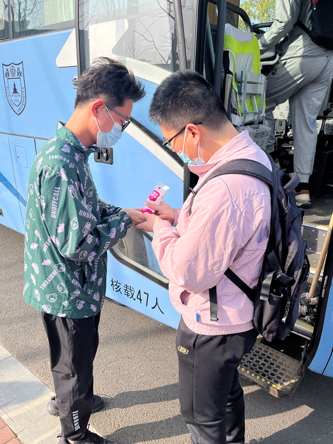 当日万里无云,正是植树游园的好时节。两个支部27名党员同志佩戴党徽和口罩,在院楼门前集结,兴致高昂。普博生第二党支部书记周倩苇谨记李敏老师叮嘱“开展党日活动的同时要保障大家的安全,注意防护”,对每一名党员同志多次进行提示,戴好口罩,做好防护。图为第一党支部书记尹知谦对每一名准备登车的党员同志进行手部消毒。