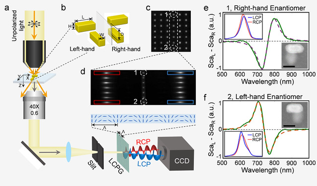 与传统圆二色光谱测量依赖于入射光的偏振调制,需多次检测不同,新方法利用基于液晶光栅特有的精准偏振分光能力将信号光进行分光,通过拍照一次性即可完成离散单纳米颗粒圆二色光谱的测量。该方法可与暗场显微镜、荧光显微镜等各类光学成像装置配合,经简单的改装后即可实现单颗粒、乃至单量子点、单分子的偏振光谱测量,解决了传统原二色谱设备昂贵、操作复杂、速度慢、难以与单颗粒成像装置耦合的难题。