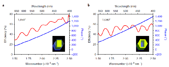 图2、(a)GaN纳米柱结构单元的共振效率和相位谱,(b)GaN纳米槽结构单元的共振效率和相位谱。