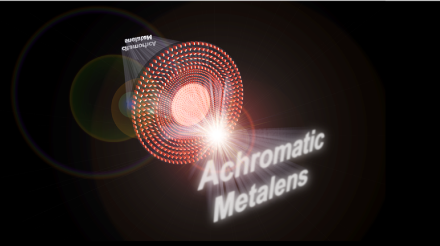 图1、基于全介质超构透镜获得覆盖全可见光消色差透镜成像的示意图。