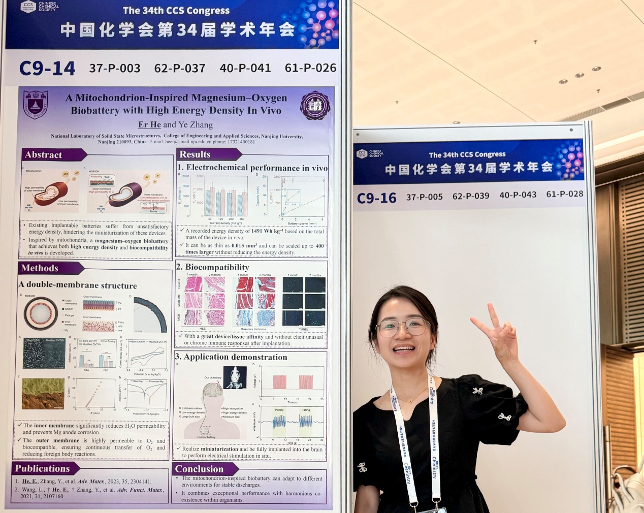 太阳成集团122ccvip张晔课题组博士生何儿的“受线粒体启发的体内高能量密度镁-氧气电池”墙报斩获大会优秀墙报奖。