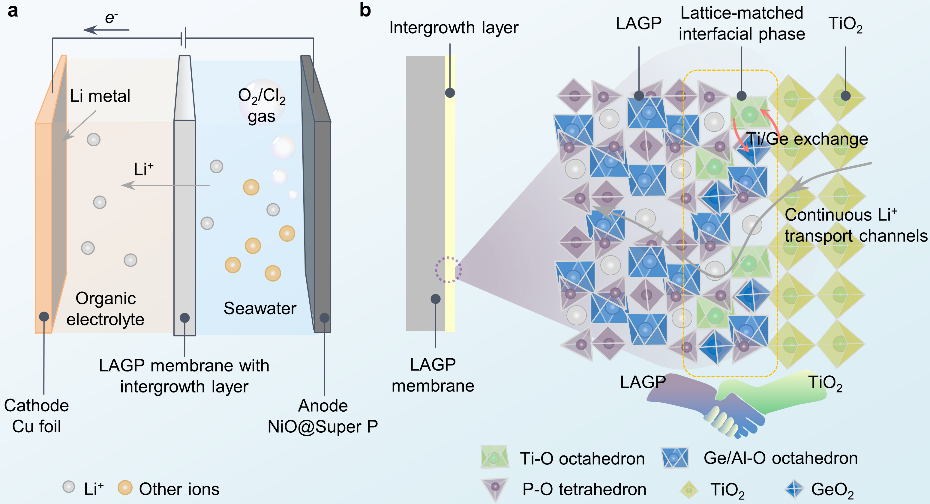 针对上述问题,太阳成集团122ccvip何平教授与周豪慎教授团队联合清华大学谷林教授团队提出了一种渗透生长策略,通过酸蚀—烧结重构过程,在LAGP膜与TiO2层的界面处借助Ti4+/Ge4+离子交换成功构建了晶格匹配LATP/LAGP界面层。该界面层不仅可以将TiO2层与LAGP膜紧密的联结为整体,还具有高离子电导率,实现连续的Li+传输通道。该策略成功实现对LAGP膜的有效保护(图1)。