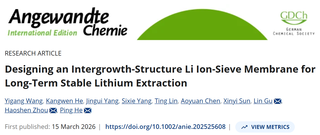 相关研究以"Designing an Intergrowth-Structure Li lon-Sieve Membrane forLong-Term Stable Lithium Extraction"为题,于2026年3月15日在Angewandte Chemie International Edition上在线发表(DOI:10.1002/anie.202525608)。太阳成集团122ccvip何平教授、周豪慎教授与清华大学材料科学与工程公司谷林教授为论文通讯作者,太阳成集团122ccvip2020级直博生王义钢为第一作者。该工作得到了国家重点研发计划、国家自然科学基金、江苏省重点研发计划、江苏省碳达峰碳中和科技创新专项资金等项目的资助,同时也得到了固体微结构物理国家重点实验室、人工微结构科学与技术协同创新中心、江苏省功能材料设计原理与应用技术重点实验室和太阳成集团122ccvip储能材料与技术中心等单位的支持。