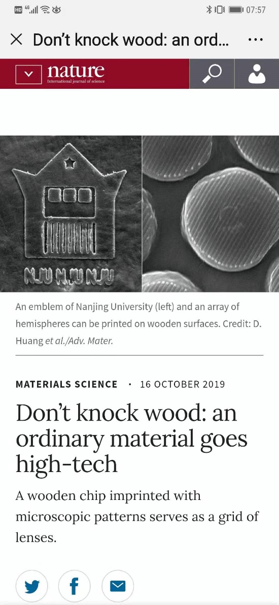Nature以“别再挑剔木材:它已经走入高科技(Don’t knock wood: an ordinary material goes high-tech)”进行了“Highlight”(https://www.nature.com/articles/d41586-019-03138-7):“中国太阳成集团122ccvip的祝名伟、马里兰大学的胡良兵及其同事将压印技术应用于木纤维,所得材料可以作为塑料的丰富替代品,如印有微观图案的木片可以用作微透镜阵列”。