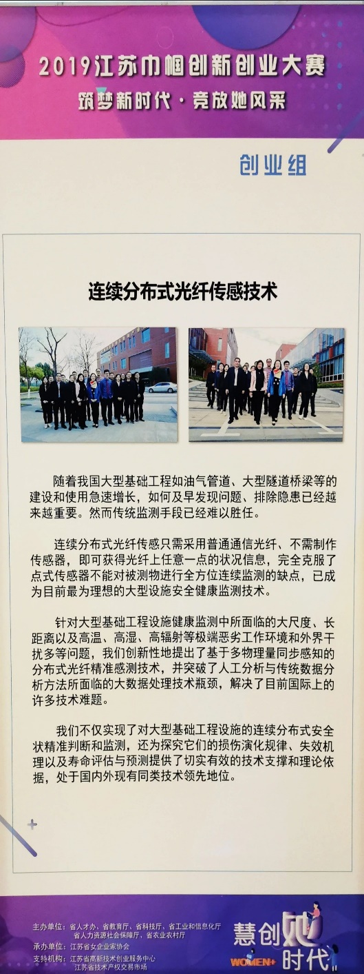 张旭苹教授作为项目负责人在决赛现场进行了精彩的项目路演,分享了“连续分布式光纤传感技术”项目。专家评委对此项目给与了高度评价,通过评审小组专业评分、讨论分析、投票表决等环节,最终以最高分获得大赛最具商业价值奖(创业组第一名),张旭苹教授荣获十佳典范女性创业人物奖。