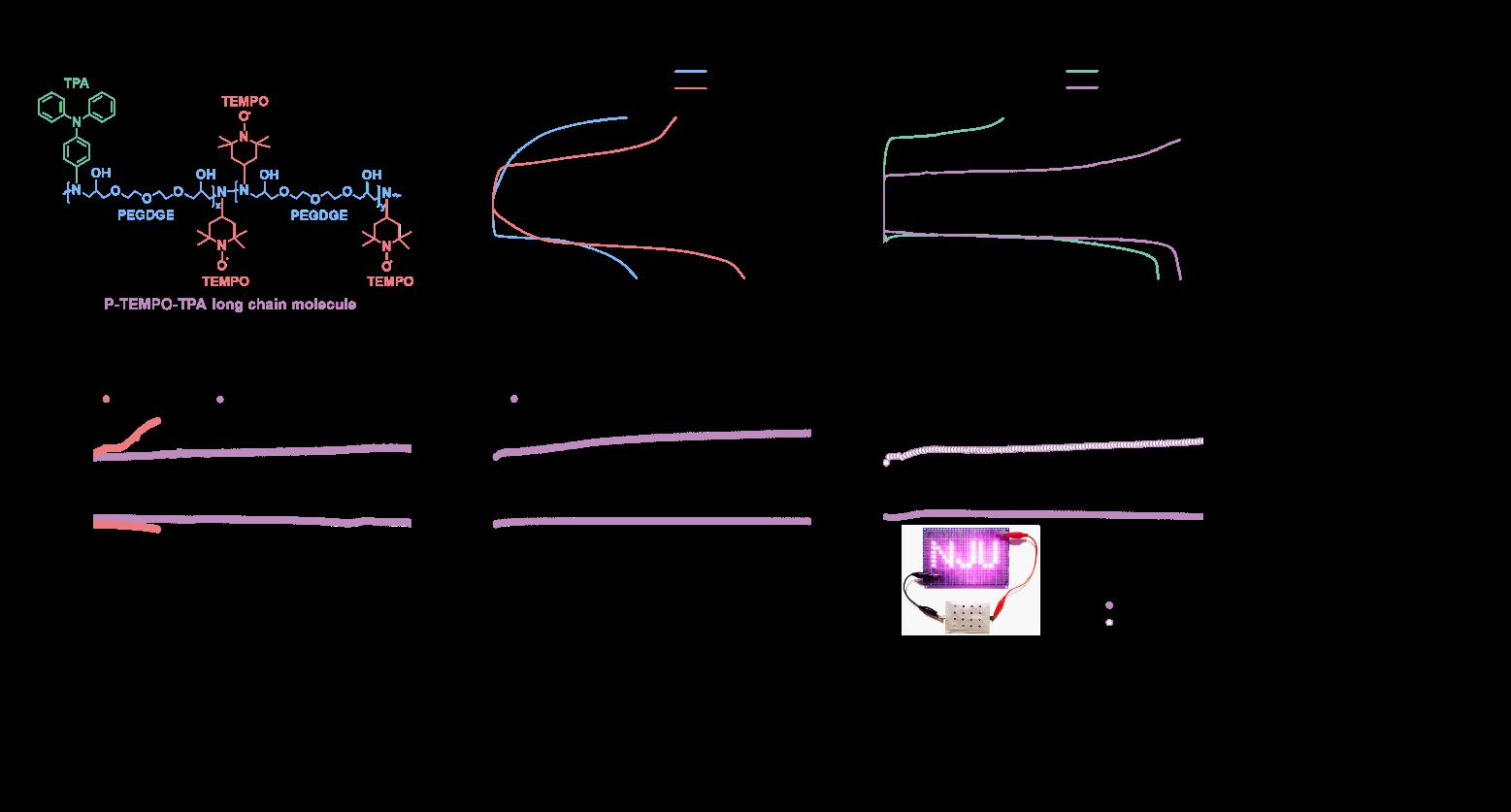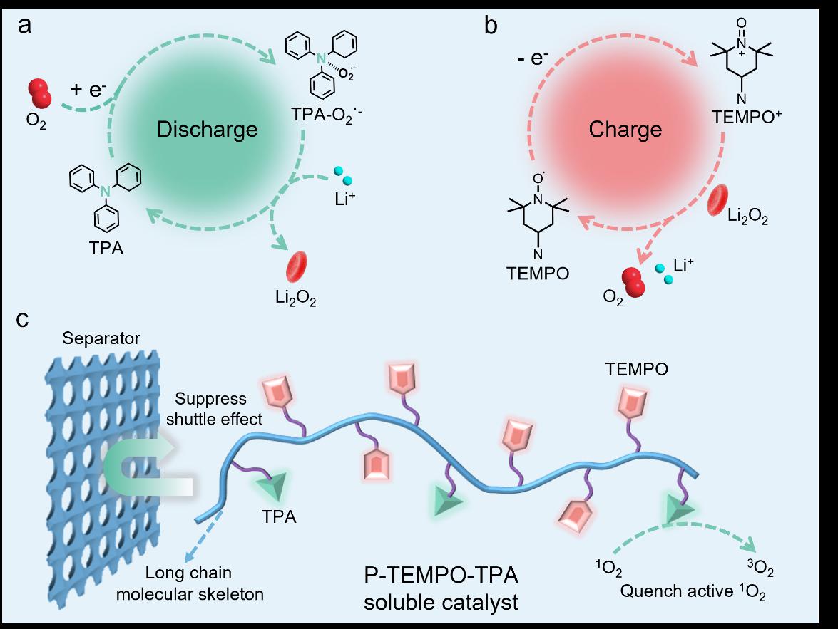 图1以P-TEMPO-TPA为可溶催化剂的Li-O2电池示意图及机理图。(a) 在放电过程中,富电子TPA通过与O2•−相互作用促进溶液介导的Li2O2形成,从而增加放电容量。(b)充电过程中,氧化后的TEMPO可以氧化Li2O2产生O2,从而减少充电过电压。(c) 长链骨架的较大尺寸抑制了P-TEMPO-TPA分子穿梭到锂阳极。同时,TPA基团还能有效将活性氧1O2淬灭至3O2,从而减少了副反应。