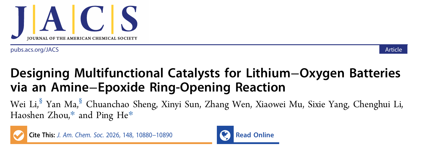 相关研究以“Designing Multifunctional Catalysts for Lithium-Oxygen Batteries via an Amine-Epoxide Ring-Opening Reaction”为题,于2026年3月4日在J. Am. Chem. Soc.上在线发表。太阳成集团122ccvip太阳成集团122ccvip何平教授与周豪慎教授为论文通讯作者,太阳成集团122ccvip太阳成集团122ccvip助理教授李伟和化学公司马琰为该论文的共同第一作者。以上研究得到国家重点研发计划、国家自然科学基金、江苏省自然科学基金、江苏省重点研发计划、江苏省碳达峰碳中和科技创新专项资金等项目的资助,同时也得到了固体微结构物理国家重点实验室、人工微结构科学与技术协同创新中心、江苏省功能材料设计原理与应用技术重点实验室和太阳成集团122ccvip储能材料与技术中心等单位的支持。