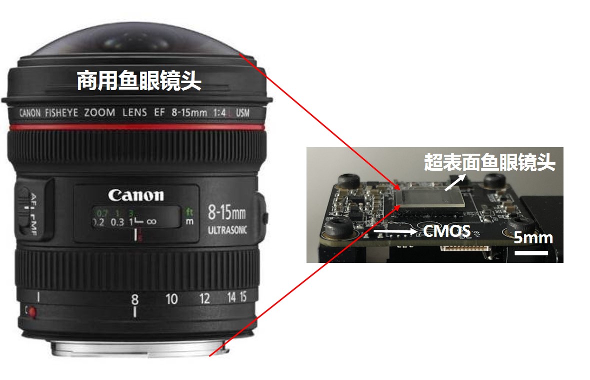 图一 商用鱼眼镜头与超表面集成广角相机对比